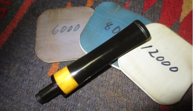 I polished the stem with micromesh sanding pads – wet sanding with 1500-2400 grit pads and dry sanding with 3200-12000 grit pads. I rubbed the stem down with Obsidian Oil after each pad. The oil both enlivens the rubber and provides bite for the sanding pads. I polished it with the 12000 grit pad and gave it a final coat of oil and set it aside to dry. (I forgot to take a photo of sanding it with 4000-6000 grit pads.)