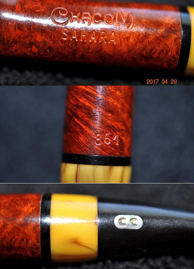 I chose to work on the Chacom Sahara first. It is a beautiful brandy shaped pipe that was in decent shape. It was stamped on the left side of the shank with the brand CHACOM over SAHARA. On the underside of the shank next to the stem shank junction it bore the shape number 864. The stem bore the Chacom CC oval logo inset in the vulcanite. There was a band of faux horn/Lucite that was part of the stem. It sat between a thin band of black and the rest of the tapered stem. My brother took the following photos before he worked on the pipes.