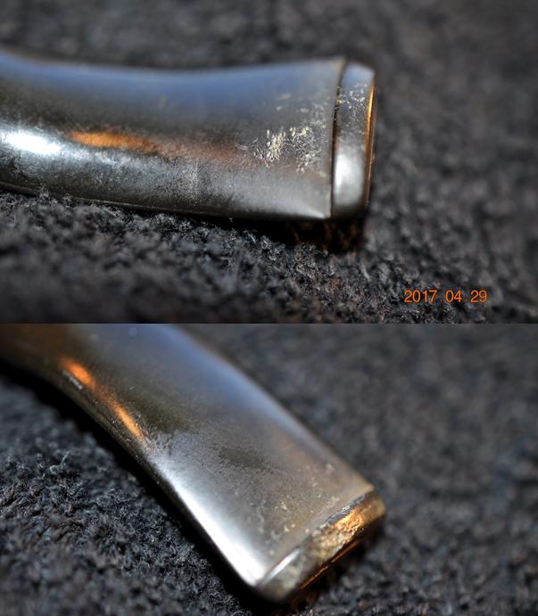 The last two photos showed the now familiar tooth chatter and marks on the top and underside of the stem next to the button. Fortunately these were not too deep in the vulcanite either and should be able to be cleaned up quite easily.