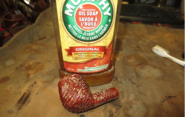 I scrubbed the bowl with undiluted Murphy’s Oil Soap and a tooth brush to remove the grime. I used a brass bristle brush with the soap on the rim surface to remove the darkening and tars. I rinsed the bowl under warm water to remove the soap and grime. I took photos of the cleaned bowl and included them below.