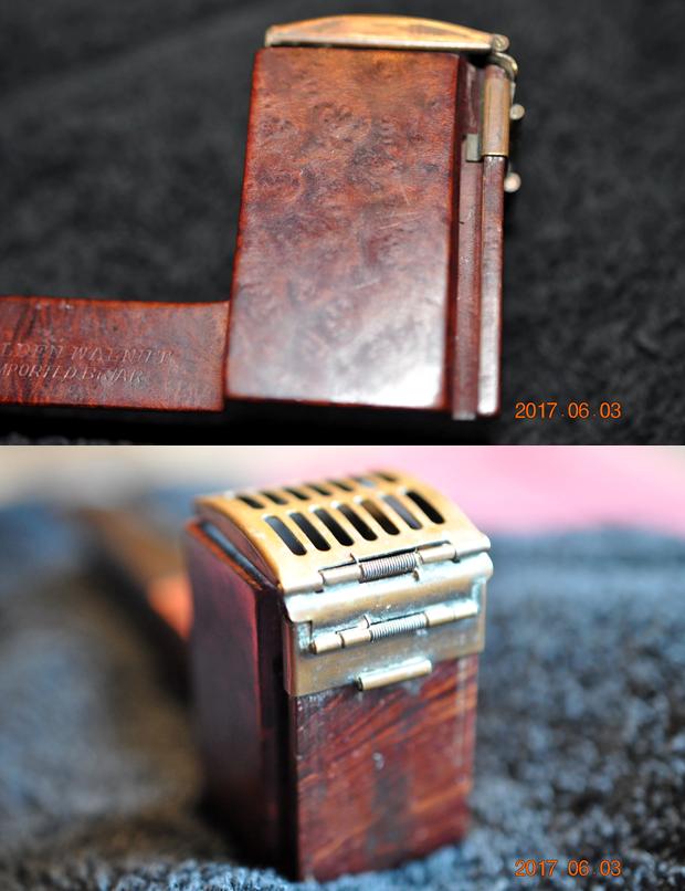 Jeff took some close up photos of the sides of the bowl. There was some pretty birdseye grain on the sides. The front of the bowl was worn and dirty. It appeared that the lid could be slid down the front of the bowl if one held the lid open. It evidently had been moved up and down the front side as it left marks behind on the briar. The underside of the bowl had some great cross grain that stood out really well with the nice brown contrast stain.