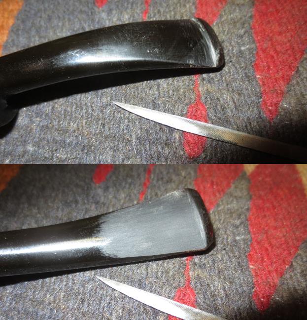 I sanded out the tooth chatter and the tooth marks with 220 grit sandpaper to clean them up as much as possible. I wiped down the surface of the stem with a damp cotton pad to remove the sanding dust. I filled in the deeper tooth marks with clear super glue and set the stem aside to wait for the repair to cure.