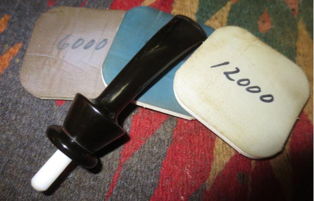 I polished the stem with micromesh sanding pads – wet sanding it with 1500-2400 grit pads. I wiped the stem down with a damp cotton pad to remove the dust. I buffed the stem with red Tripoli on the buffing wheel before continuing to polish it with micromesh sanding pads – dry sanding with 3200-12000 grit pads. When I had finished the polishing I wiped it down with a damp pad and gave it several coats of Conservator’s Wax. I buffed the stem with a microfiber cloth to deepen the shine.