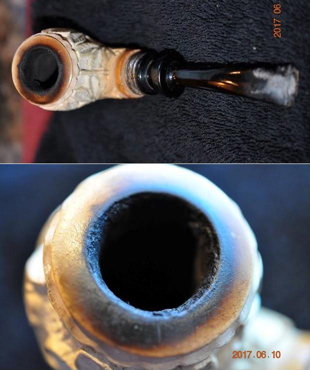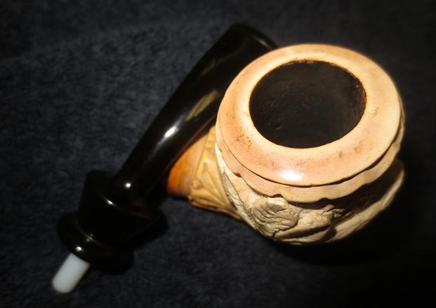 Jeff reamed the bowl carefully with a PipNet reamer and a Savinelli Fitsall Pipe Knife scrapping the cake back to the meerschaum wall of the bowl. He scrubbed the exterior of the pipe and rim with Murphy’s Oil Soap and was able to remove the entire lava overflow on the rim and the dust and grime from the nooks and crannies of the carving. He cleaned the internals with pipe cleaners, cotton swabs and alcohol until the surface was clean and refreshed. I took photos of the pipe when it arrived in Vancouver to show his craftsmanship in the cleanup phase of refurbishing. He does very good work and it makes my job much easier on this end.