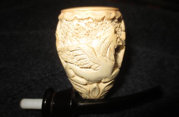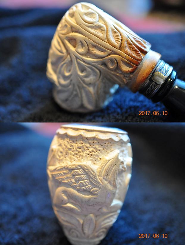 The photos on EBay show the dirty condition of the pipe but also show that it is in excellent shape under the grime and the dirt. My brother was wise in bidding and winning this beautiful example of Koncak workmanship. The photo of the bowl front shows the winged horse, Pegasus in a reclining position. The carving is quite well done. The details of the feathers on the wings, the mane on the horse’s head and the surrounding foliage around Pegasus are well done.