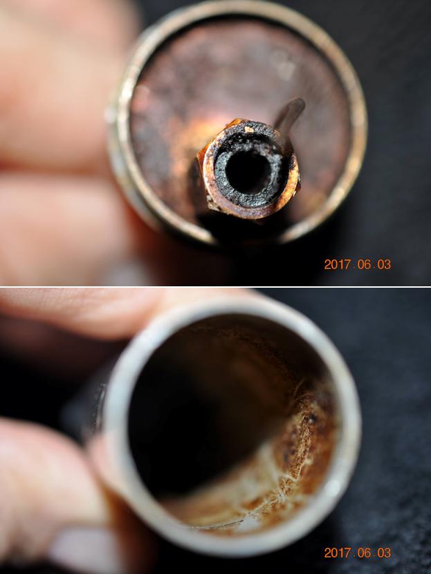 The next photos show bent wire that the toilet paper is wrapped around as well as the end of the tenon sitting in the end cap. It appears to be a nut that is threaded onto the tenon of the stem. The buildup of tars, oil sand dried tobacco “lacquer” is thick in the tube, on the end cap and the tenon nut.