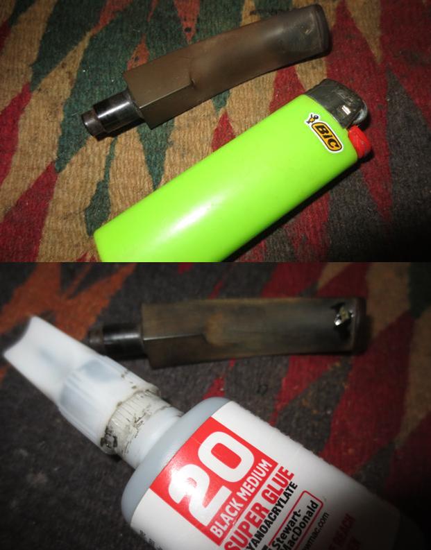 I decided to change my normal routine a bit and used amber coloured super glue from Stewart MacDonald to stabilize the horn around the button and up the surface of the stem for about an inch. This would bind together the strands of the horn and build up the tooth damaged areas on the surface. Once it dried I would be able to smooth out the repaired surface and blend it into the rest of the stem. I had an idea that the amber super glue would blend in better with the colours of the horn in this particular stem.