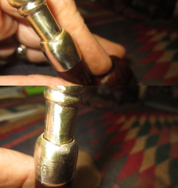The next photos of the stem and end cap show the brass shining through and the oxidation on the surface of both sides. The tooth marks and chatter are also visible. Fortunately they do not appear to be deep.