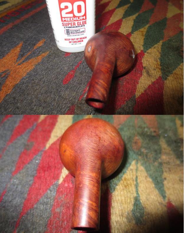 With the bowl finished I directed my attention to the stem. I cleaned out the damaged areas with a dental pick and sandpaper and filled them in with black super glue. The photos below show the repairs on both sides of the stem. The third photo shows the repairs further up the topside of the stem.