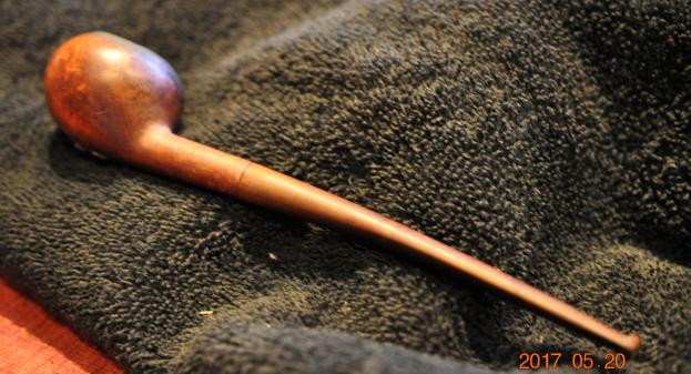 The next pipe on the worktable is a mini churchwarden prince shaped pipe. It has a delicate look to it and is very lightweight. It is petite with a length of 6 ¾ inches, height of 1 1/8 inches, bowl diameter of 1 ½ inches and a chamber diameter of 7/8 inches. The pipe is stamped on the left side of the shank Imperial in script with a flourish underneath. Below the flourish it reads De Luxe. On the right side of the shank it is stamped Made in London over England with a shape number 15. The next photos of the pipe show what it looked like before my brother did his clean up work.