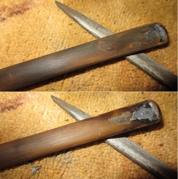 When the glue had cured I used a file to bring the thickness of the repairs down to the surface of the stem. I used to do all this with sandpaper but figured out that the file actually sped things up a bit. I sanded the stem surface and repairs with 180 grit sandpaper after the file to smooth out the surface and remove more of the oxidation. I would need to sand it with higher grits to remove the scratching but it was at least getting better. I used a needle file to reshape the edge of the button and the top and underside surfaces of the button.