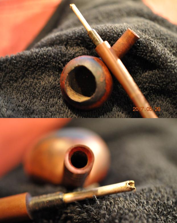The next photo shows the bottom of the stummel and the thick glue/paper coat that is stuck to that part of the bowl. It appears to me that someone had the pipe stuck to some fibre board in a display case of pipe shapes. Possibly, it was a shadow box of “dad’s” or “grandpa’s” and this one was a centerpiece. Following that photo are three different pictures of the inner tube that sat in the bottom of the bowl. The end on these is usually slanted with the longer edge sitting on the bottom of the bowl and the shorter edge ending at the entrance of the airway into the bowl.