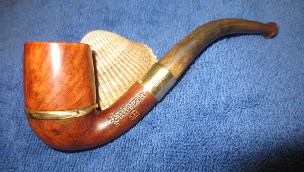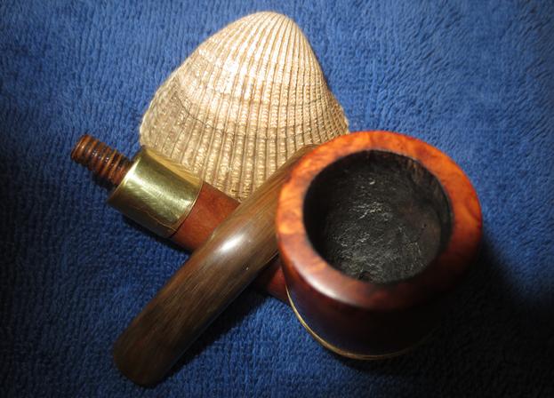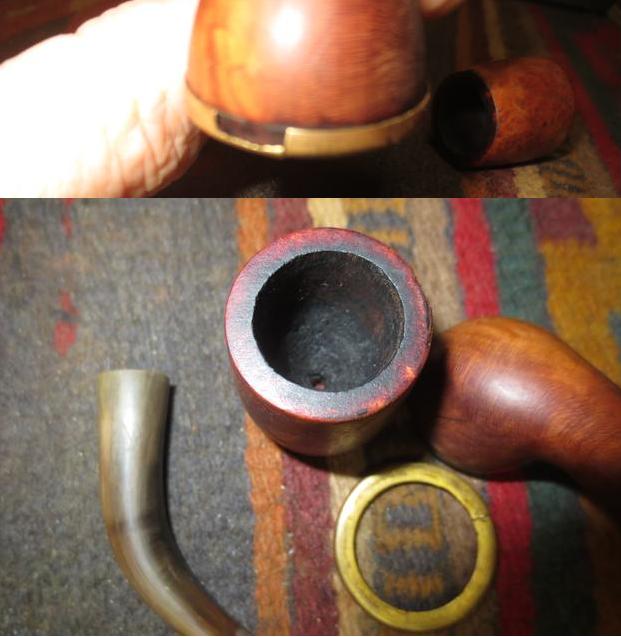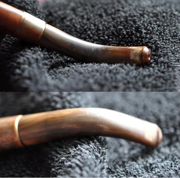 I polished each part of the pipe separately with Blue Diamond polish on the buffing wheel. I gave each part multiple coats of carnauba wax to protect the briar and the horn and help the brass from oxidizing. With all the parts cleaned and polished it was time to put the pipe back together again. I thread the bowl onto the base and screwed the stem onto the shank. I aligned everything and carefully hand buffed the pipe with a microfiber cloth to deepen the shine. The finished pipe is shown in the photos below. For a pipe over 125 years old it looks pretty good. It is cleaned and ready for its first smoke post restoration. It should work well and should last a lot longer than this old refurbisher will. It will pass on into the hands of another pipeman who enjoys the unique qualities of old briar and horn stems. Thanks for looking.