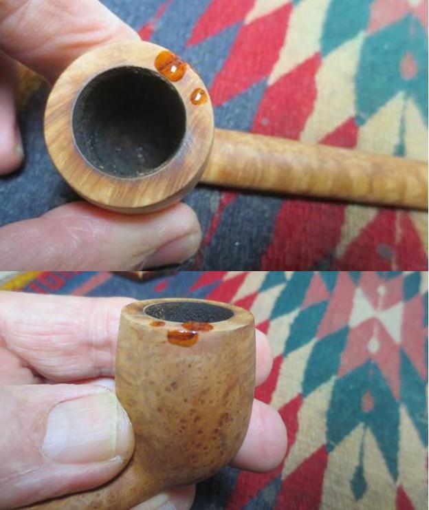 After I rinsed the bowl and rim I could see the two areas on the right top of the bowl that were sandpits. One of them had a large crumbling fill that went across the rim top (not quite as far as the inside edge of the bowl) and then curved down the side toward the back of the bowl. I cleaned the fill with a dental pick to clean up the putty. I repaired the fill with clear super glue and a little bit of briar dust. The photos below show the repaired areas.