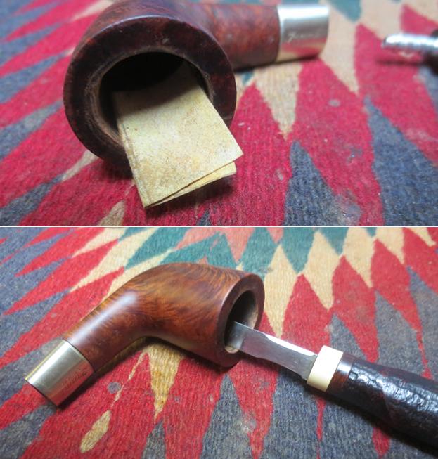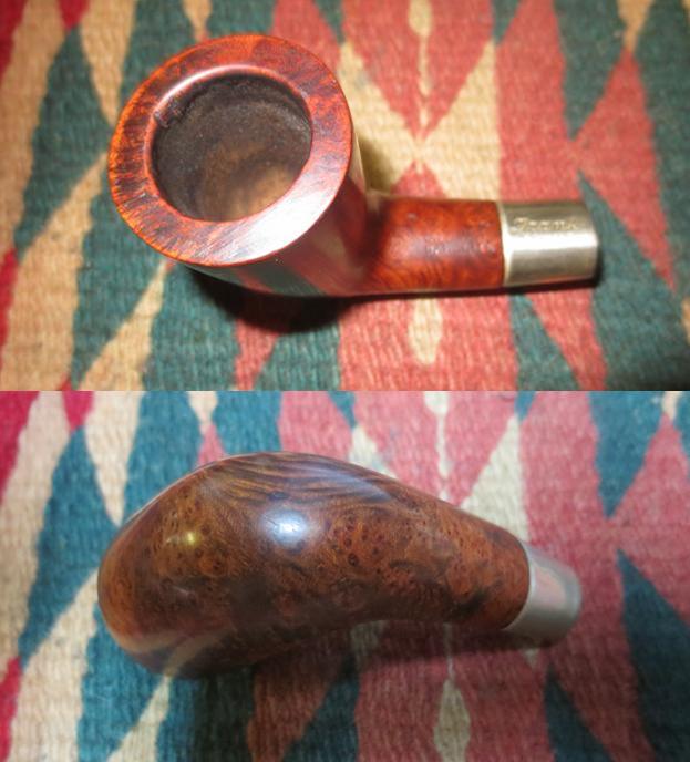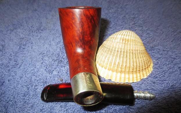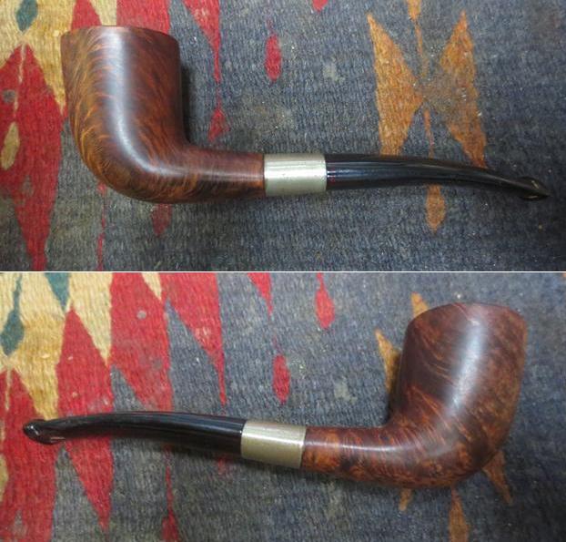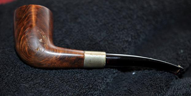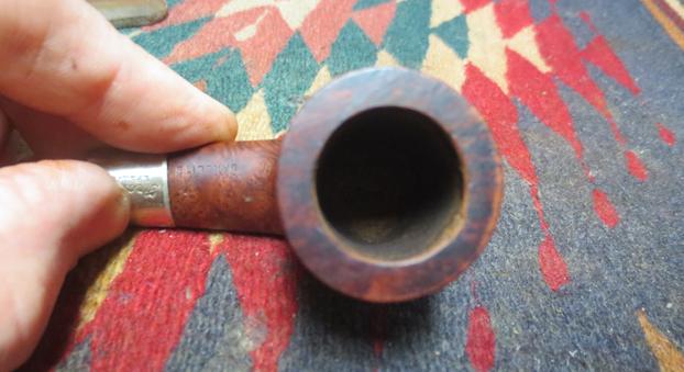 The stamping on the top of the shank is readable. The script Frank is fainter than the BAKELITE stamp but both are readable. The stamping on the silver is also clearly stamped on the top side of the band. When I received the pipe the band was loose and it was upside down on the shank. When the stem was unscrewed off the shank the metal tenon was visible. The band fell off and it is clear that the shank was sanded more on the left side than the right which made the fit on the shank quite crooked. More of the band extended past the right side of the briar than the left side.