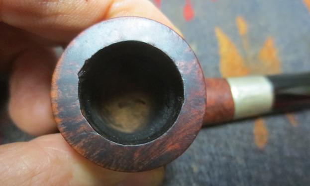 With the stem finished and the glue set on the band I turned to work on the bowl. I used a folded piece of 220 grit sandpaper to rework the inner edge of the bowl. I sanded out the damaged edge of the bowl and reshaped it to make it round once again. I did not bevel it, but kept it smooth to match the original bowl. I used the Savinelli Fitsall Pipe Knife to clean up the reaming of the bowl and remove the remnants of cake that were left. I used a 1500 grit micromesh sanding pad to smooth out the sanded edge of the bowl. The last photo of the bowl shows the repaired inner edge of the bowl.