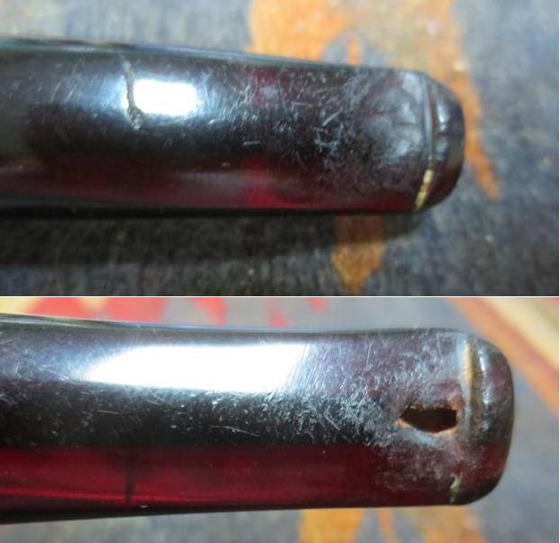 The red Bakelite stem had a deep scar on the top side mid stem. There were a lot of deep tooth marks and indentations on the top of the stem and the button showed tooth marks.