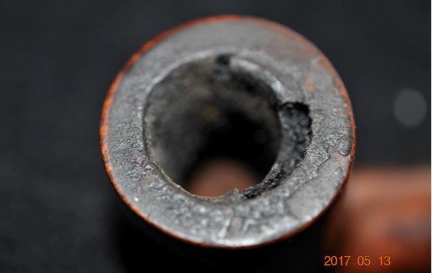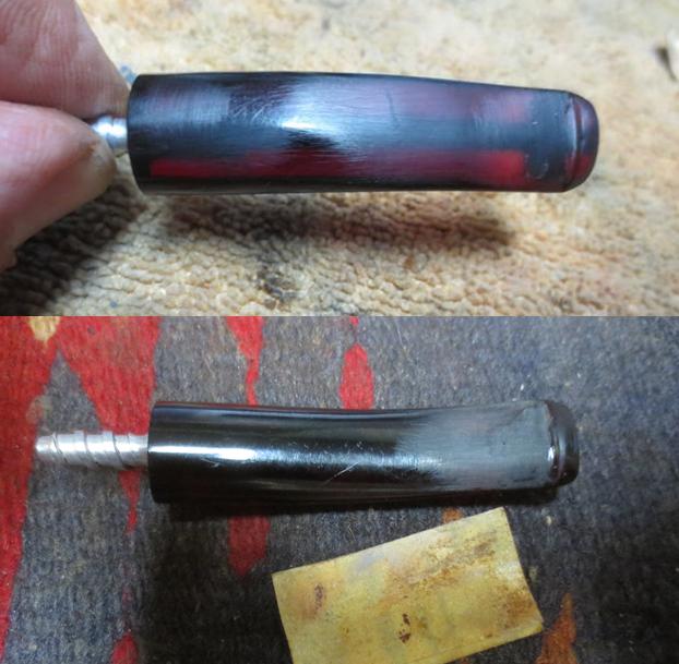 The next two photos of the stem show the deep tooth marks on the top of the stem, the wear on the button and the hole in the underside of the stem in front of the button. Both sharp surfaces of the button were worn down from tooth marks.