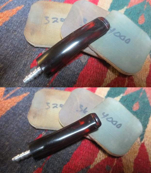 Once the repair hardened I used a needle file to reshape the sharp edge of the button and flatten out the surface of the stem on both sides. I sanded the cut on the top of the stem with 220 grit sandpaper until it was smooth. I sanded the rest of the stem and the repaired areas with the sandpaper until the repairs were blended into the surface of the stem sides. The mixture of super glue colours worked well with the reds of the Bakelite stem. I polished the repaired stem with micromesh sanding pads – wet sanding with 1500-2400 grit pads and dry sanding with 3200-12000 grit pads. I wiped the stem down with Obsidian Oil after each pad. I have found that it works well on the old Bakelite stems.