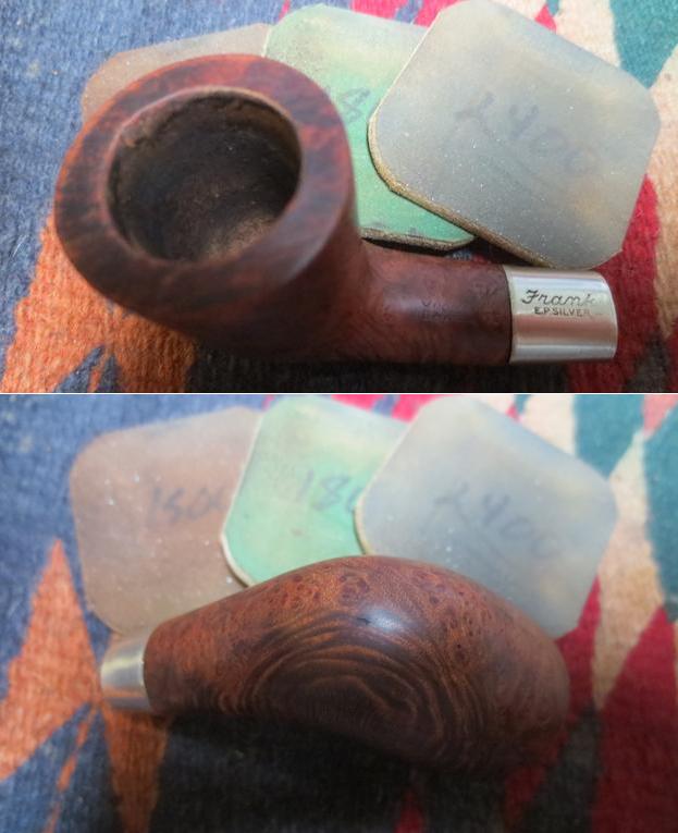 The next pipe that I brought to my work table came from the virtual pipe hunt that my brother and I did in Montana. I have written a few blogs about that hunt as it contained a lot of late 1890s and early 1900 era pipes. These included C.P.F., W.D.C. and some no name pipes from the same era. If you are interested in reading any of them, a quick search on the blog for “Virtual Pipe Hunt” will give you the links to a blog about the hunt and to other pipes that were included. This particular pipe was a Zulu shaped pipe with some interesting grain (birdseye, swirled and cross grain) on the bowl and a red Bakelite/Redmanol stem. The finish was very worn and there was some hard glue like residue stuck on the left side of the bowl that looked like the pipe had been glued to a display board of some kind. The top of the shank was stamped Frank in script over BAKELITE. There was a silver band on the shank stamped with the same Frank script over E.P. Silver (Electro Plated Silver).