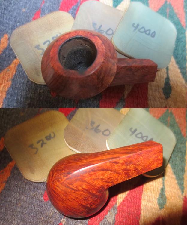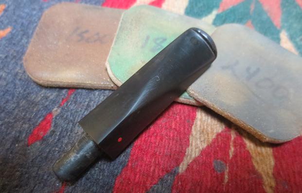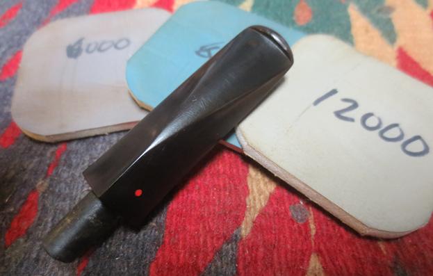 Polishing the stem was a harder prospect and took more work than the bowl. The sanding and polishing process repeatedly revealed new air bubbles in the newly built up underside of the stem and button. I sanded and added drops of clear super glue to take care of each air bubble. It was tedious but it paid off. I polished the stem with micromesh sanding pads – wet sanding with 1500-2400 grit pads and wiping down the stem after each pad with Obsidian Oil. I checked for new air bubbles and then went on to dry sand it with 3200-4000 grit pads. I gave it a coat of oil after each one and then finished polishing it with 6000-12000 grit pads. I repeated the oil after each pad and after the 12000 grit pad I set the stem aside to dry.
