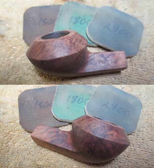 I wiped down the briar with alcohol on cotton pads to make it more transparent. After wiping it down the grain shone through the stain coat. I think that once it is polished it would be a beautiful finish for this Dr. Plumb.