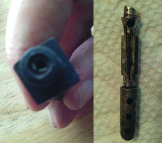The final two photos pin point the second issue that he was having with the pipe. The metal stinger threaded into the tenon that comes on all Dr. Plumb pipes had been broken off with the threaded portion of it stuck in the tenon and extending part of the way up the stem. His photos included a tenon end shot and a photo of the broken stinger by itself. You can see the ragged edge of the end that would have sat flush against the end of the tenon.