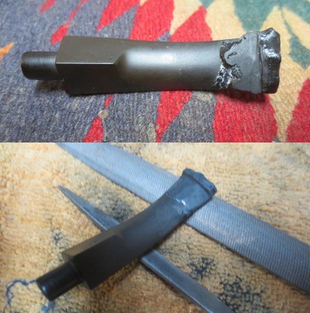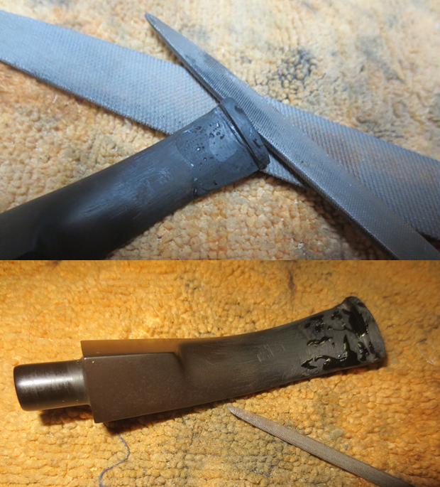 Once the repairs had cured I used needle files to reshape the button and slot in the end of the stem. There were a few more air bubbles that showed up as I reshaped the button. Once they dried I sanded repaired spots. I used the files to cut the sharp edge of the button. When the spots dried I sanded the surface of the stem with 220 grit sandpaper to smooth out the repaired areas and blend them into the rest of the stem.