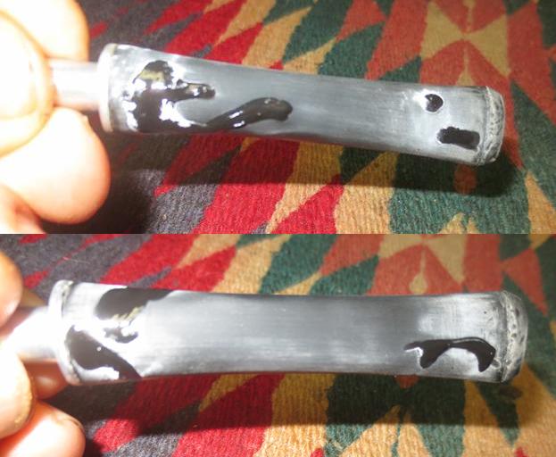 The stem was a mess so I decided to clean it and do some repairs to all the damaged spots with black super glue. It would take time for the glue to harden, so I applied it and gave it a quick shot of accelerator. The accelerator dried and turned to a white powder on the rest of the stem as seen in the photos below. I set the stem aside to dry and called it a night.