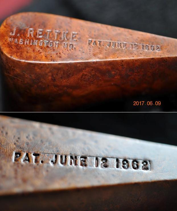 The next two photos show the stamping on the bottom of the bowl. They are fascinating in that they not only identify the maker but they tell about his method of stamping the pipe. The second photo shows the date stamp and you can see that the patent date is on a bar and the bar was pressed into the briar leaving a faint imprint behind the date stamp. The stamping reads J. Rettke over Washington, MO. and next to that it reads Pat. June 12, 1962.