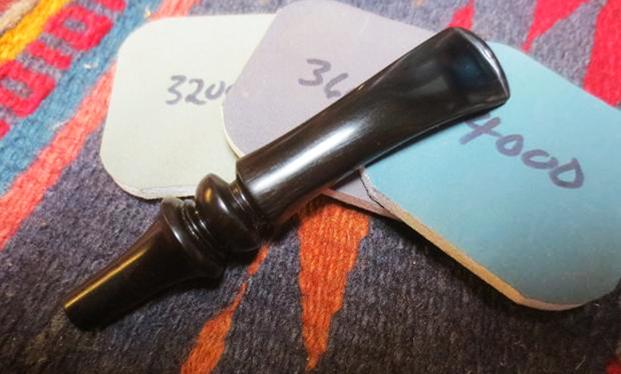 I sanded the stem surface with 220 grit sandpaper to smooth out the repaired areas and blend it into the surface of the stem. I reshaped the button at the same time. There still appeared to be a small crack on the top left side near the button. It was a very tiny hairline crack and was tight so I filled it in with clear super glue and sanded it smooth.