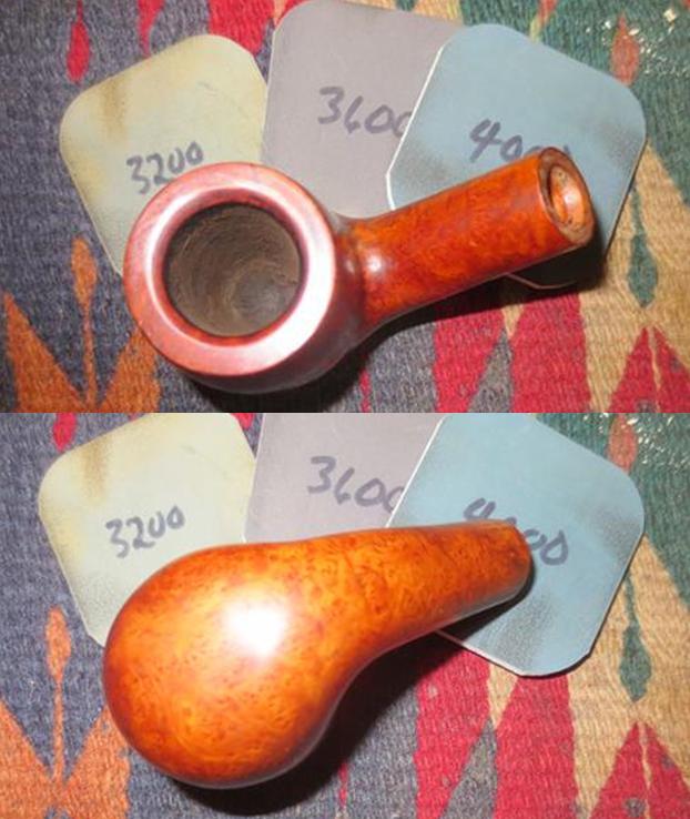 I buffed the bowl with Blue Diamond to polish it a bit and see where I needed to do some work before the final buff. I hand polished the stem with micromesh sanding pads – wet sanding with 1500-2400 grit pads and dry sanding with 3200-12000 grit pads. I wiped the bowl down with a damp clot after each buffing pad. I hand buffed it with a microfibre cloth after the 12000 grit pad. The pictures below show the progress of the polishing on the briar.