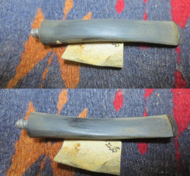 The photos of the stem show the condition of the vulcanite. The oxidized surface of the rubber was pitted and worn. The light tooth chatter on both sides can be seen in the photos.