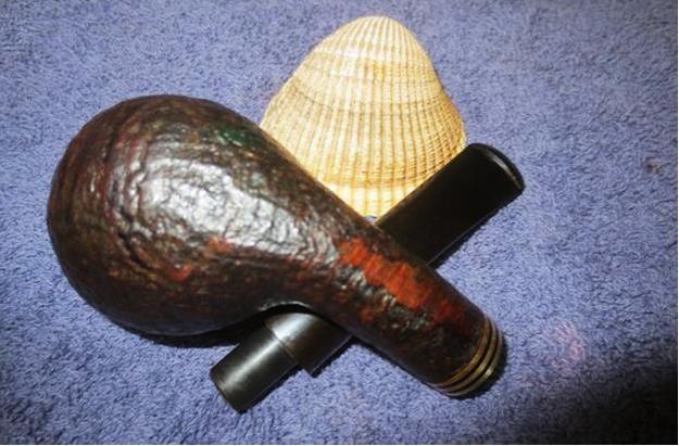 The photos of this Georg Jensen bent apple made the pipe look pretty good. The sandblast finish look pretty good and the stain is mottled but look like it may have been intended to look that way. The bowl had a cake but not too thick and the lava overflow on the rim top appeared average and not much work. The stem was lightly oxidized with most of the oxidation occurring around the button. There was the characteristic GJ stamp on the left side of the stem. It looked like the stem had worn one of the rubber bite guards as the sludge that usually accompanies the removal of those was on the stem. There was tooth chatter on both sides of the stem and a deeper tooth dent on the underside near the button. The pipe was stamped Royal Navy over Hand Made in Denmark with the shape number 93 on a flat smooth band on the underside of the shank. There was a black and brass band on the shank end. My brother took photos before he did his cleanup work on the pipe.