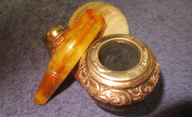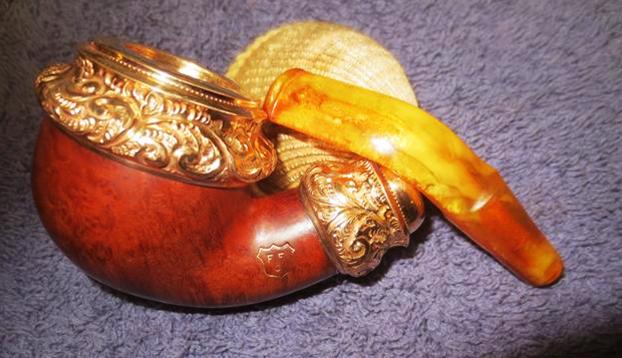 When the pipe arrived in Vancouver, I could see that Jeff had done a lot of cleaning and scrubbing on before he sent it to me. The scrubbing of the gold filigree would have been a labour of love in that it was so intricate and detailed that the grit and grime would have fought hard to remain in all of the crevices. He had reamed the bowl with a PipNet pipe reamer and a Savinelli Fitsall Pipe Knife. He cleaned up the rim and the exterior of the bowl with Murphy’s Oil Soap to remove the grime and debris on the briar itself. He exercised care around the gold stamping on the left side of the shank. He had cleaned out the mortise and the airway in the shank and the stem with alcohol, cotton swabs and pipe cleaners. The stem damage was clearly visible and the nicks and marks stood out in clarity. There were some deep tooth marks on both sides of the stem at the button and the slot in the button still had some tars and dark spots in the corner of the slot. When I brought the pipe to my work table I took some photos of it as I opened the case. It really was a beautiful old pipe.