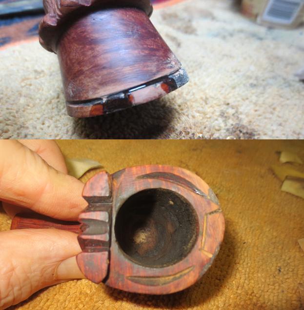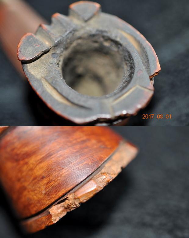 The bowl had a thick cake that had overflowed onto the rim top. The lava was flaking and dirty. The grooves on the rim top were filled with dust and dirt as well as the lava. The outside front edge of the bowl was chipped and had large piece of briar missing as shown in the top view and front view of the bowl.
