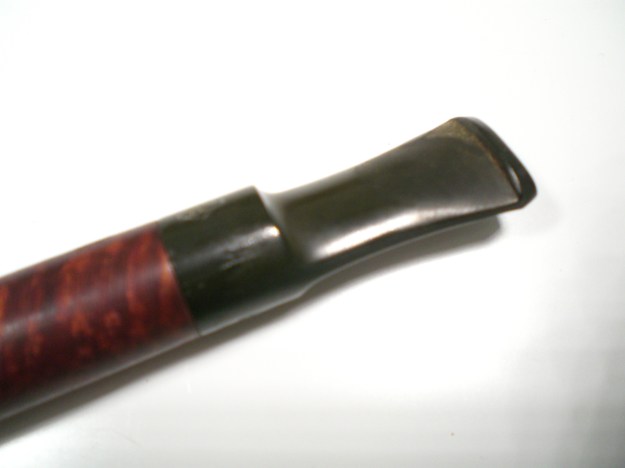 Following the soak, the stem was mounted. I was able to remove most of the tool-type marks with some 800 grit wet paper, without altering the profile of the stem. The tooth indentions lifted slightly, but they were so shallow, I left well enough alone. Oxidation was removed with 800, 1,500 and 2,000 grit wet paper, followed by 8,000 and 12,000 micromesh sheets. A worn piece of 2,000 grit wet paper removed most of the rim top darkening without breaking the stain. The stem was then buffed with White Diamond and Meguiars Plastic Polish.