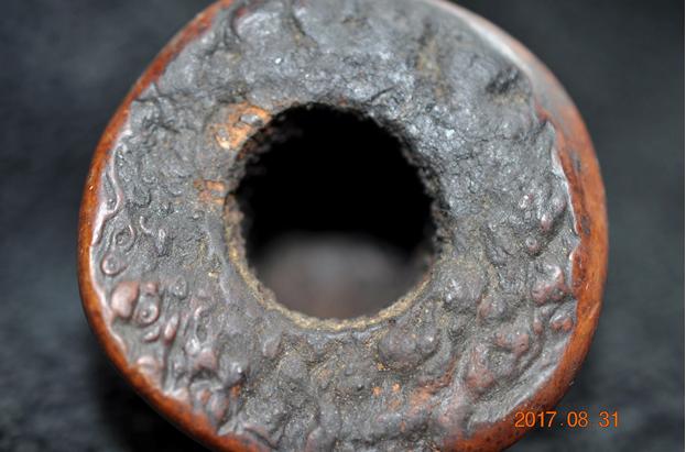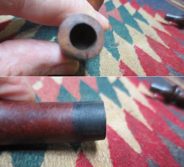 He told me that pipe was a gift from a partner and he really wanted it repaired. The briar was beautiful grained on the smooth part and faded into a swirled and dotted rustication pattern. The rim top was plateau briar and had been left natural. There was a shank extension that was marbled green, golds, yellows and blacks and really worked well with the patterns on the briar. I looked down the shank of the pipe and could see a lot of debris that was built up in the mortise and airway. It appeared to be tars and pieces of debris from the broken stem. The bowl still had some remnants of tobacco inside. It had a rich tobacco smell that was intriguing. I asked him what tobacco he smoked and he said that he primarily smoked a dark natural tobacco from the Amazon called Mapacho.