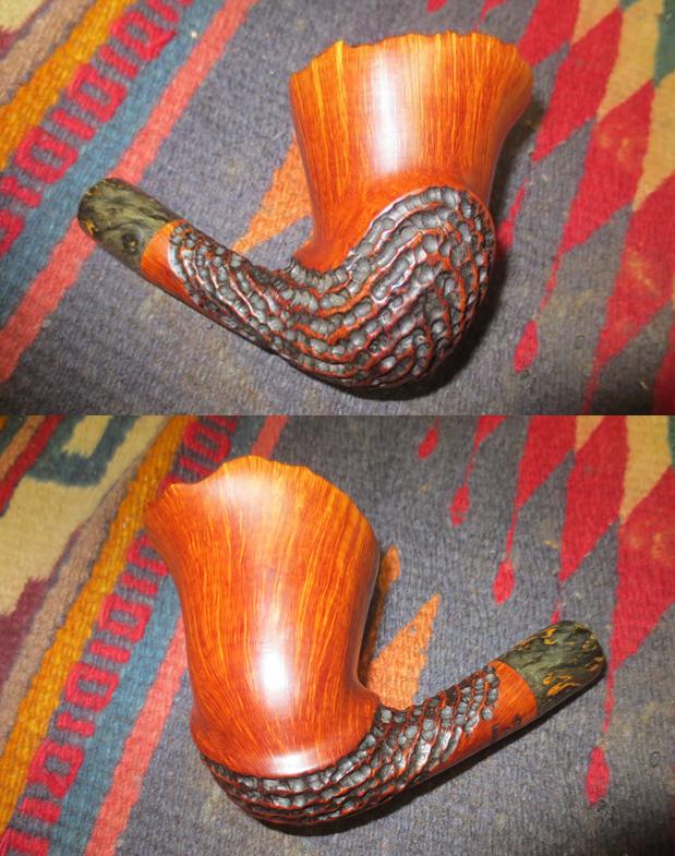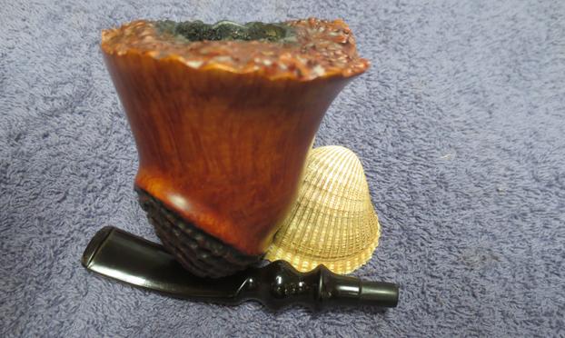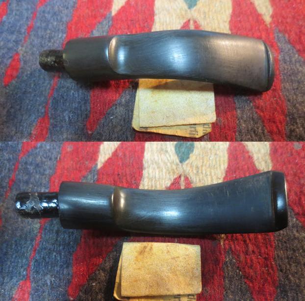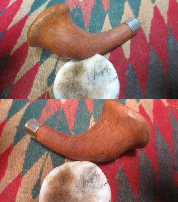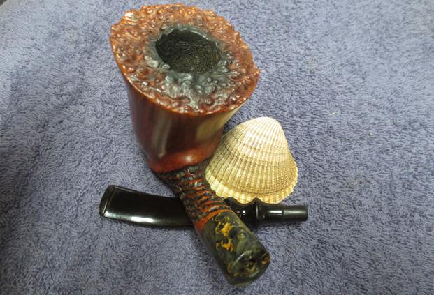 I asked him if he wanted me to clean up the bowl, ream and polish the pipe while I made a stem. He did not think it was necessary as it did not have a thick cake and he had taken good care of it. So I brought it home to fit a new stem. I checked out the inside of the mortise and shank with pipe cleaners, cotton swabs and alcohol to make sure that I could get a snug fit with the new stem. I pushed a pipe cleaner through the airway and cleaned out the debris. I waxed the bowl with Conservator’s Wax and buffed it with a clean buffing pad to raise the shine. I took pictures of the polished pipe. It really is a beauty and the contrast of finishes with the marbled shank extension of the really work well together.