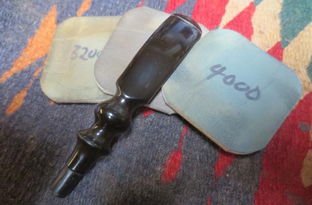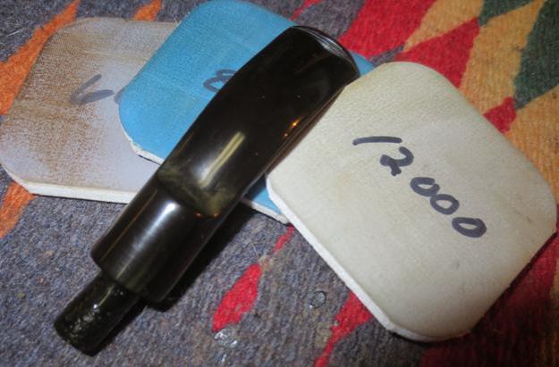 I sanded the stem surfaces with 220 grit sandpaper to remove the light oxidation and scratches on both sides of the stem. I sanded the end of the button and the sides of the stem to remove the casting marks on the stem. I worked on it until it was black and there was no remnant of oxidation or the casting marks left on it. I polished the stem with micromesh sanding pads – wet sanding it with 1500-2400 grit pads and buffed it with red Tripoli to remove the oxidation that showed up in the first photo below. I dry sanded it with 3200-12000 grit pads. I rubbed the stem down with Obsidian Oil after each pad to give traction to the next pad and also bring a little life to the vulcanite stem. After the final pad I gave it a last coat of the oil and set it aside to dry. I buffed the stem with Blue Diamond and gave it multiple coats of carnauba wax. I buffed it with a clean buffing pad to raise the shine. The next series of photos show the development of the shine on the rubber stem.