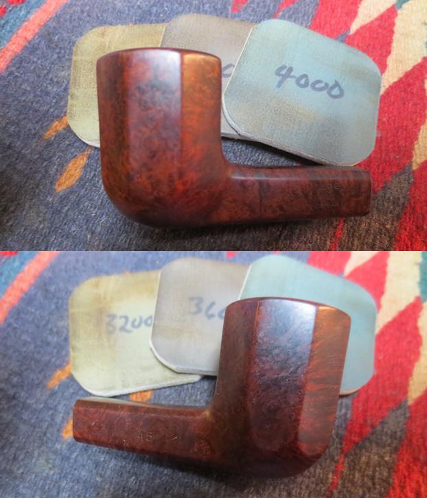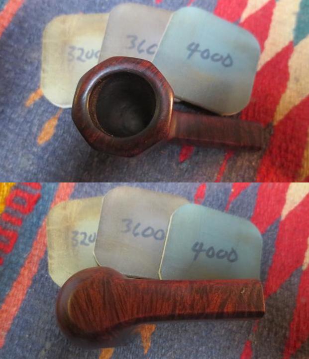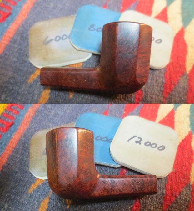 I lightly buffed the bowl with Blue Diamond to polish it to see where I needed to do some work before the final buff. I hand polished the briar with micromesh sanding pads – wet sanding with 1500-2400 grit pads and dry sanding with 3200-12000 grit pads. I worked on the beveled inner edge of the bowl to clean it up some more. I wiped the bowl down with a damp cloth after each pad. I hand buffed it with a microfibre cloth after the 12000 grit pad. The pictures below show the progress of the polishing on the briar.