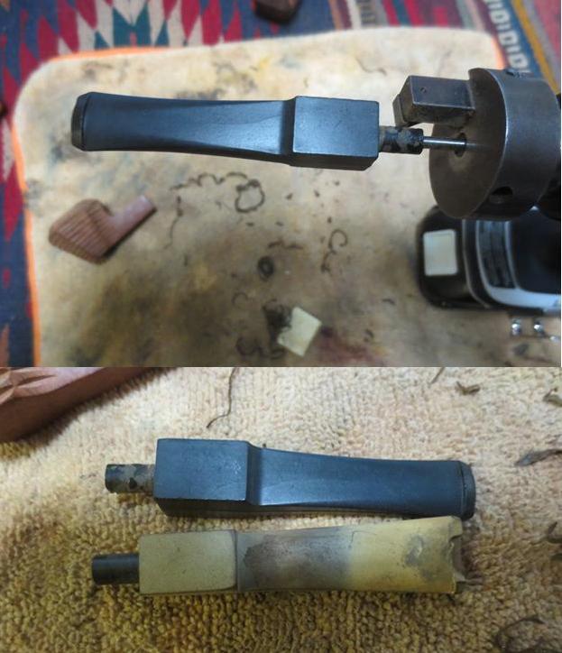 I put aside the damaged replacement stem and took a new square stem blank out of my box of stems. I turned the tenon on the PIMO tenon turning tool on my cordless drill to take down the tenon to fit the shank of the Edwards pipe. Once I had the tenon turned I wiped it down with a damp cloth and took a picture of the new stem next to the one I was replacing.