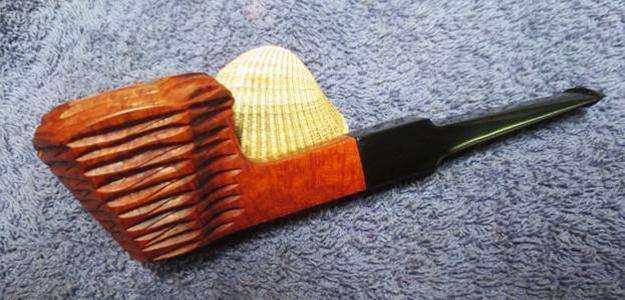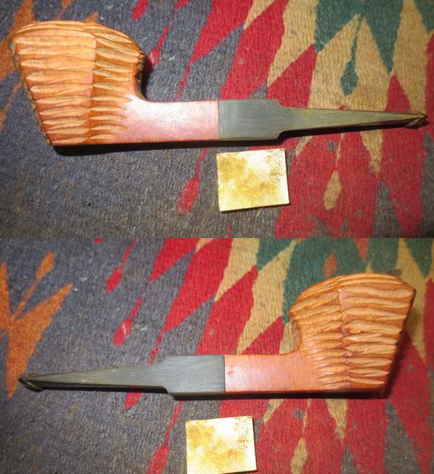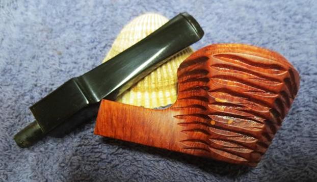 I put the stem back on the bowl and buffed the entire pipe with Blue Diamond on the buffing wheel to polish the stem and the bowl. I used a soft touch around the stamped areas as I did not want to flatten them or polish them away. I buffed stem hard to work over the remaining scratches in the rubber. It took some work but they are smoothed out. I gave the stem multiple coats of carnauba wax buffed it with a clean buffing pad to raise a shine. I gave the bowl multiple coats of Conservator’s Wax and rubbed it into the sandblast and the plateau areas. I buffed it with a shoe brush and then with a clean buffing pad to raise the shine. I hand buffed the pipe with a microfiber cloth to deepen the shine. The interesting carved finish on the bowl with its natural oil finish and the new stem combine to present a beautiful pipe. The pipe has been given a total makeover and the new stem fits the shape very well. The finished pipe is shown in the photos below. I think William is going to really like the new look and feel of this pipe. I have one more of his to finish up and then the pair will go back to him in the mail. Thanks for looking.