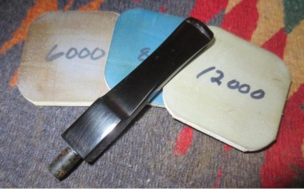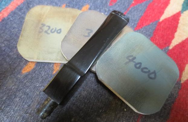 I sanded out the casting marks and scratches on the stem with 220 grit sandpaper. There were quite a few scratches left behind by the work I did to fit it to the shank. Once I had the majority of deep scratches sanded out, it was time to work on it with micromesh sanding pads. I used the micromesh sanding pads to polish the stem. I wet sanded it with 1500-2400 grit pads and wiped it down after each pad with Obsidian Oil to give the next pad more bite when I sanded. I dry sanded it with 3200-12000 grit pads and again wiped it down with the oil after each pad. After the final pad I wiped it down with a final coat of oil and set it aside to dry. In the last photo of the three below you can still see some light scratches in the vulcanite on the saddle part of the stem. These would need to be buffed out on the wheel. (I polished the tenon as well as can be seen in the photos below. Each photo shows it progressively getting a shine.)
