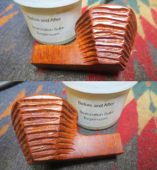 With the stem almost finished I took it off the shank and used the Mark Hoover’s Before & After Restoration Balm on the briar. I rubbed it into the grooves on the bowl sides with my finger and a cotton swab. I wanted it to go deep in the grooves to further test the effectiveness of the product. This would be a good test as it is a totally different finish than any of the other pipes I have worked on with the product. Mark had said that the product can be used on briar or stems – whether vulcanite, acrylic or horn. He said it was designed to pull the dirt off of the briar as well as polish it. He added some anti-oxidants to keep the briar from getting damaged from both UV rays and water. Once I had all the grooves and surfaces of the bowl covered I worked it into the finish with a cotton pad to see if it pulled out the dirt. It seemed to work very well and I took the following photos to show the results. So far the product seems to be delivering as promised. I will continue using it for a while and see how it works in a variety of settings before I give an opinion of the product.