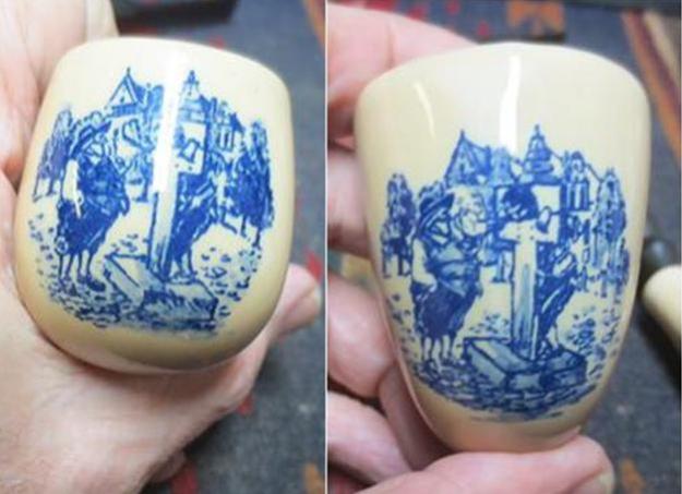 The paintings on both bowls were identical – a painting of a scene that is a famous picture from Troost Tobacco where one man is in the stocks and another, rather portly man is helping him smoke a pipe.