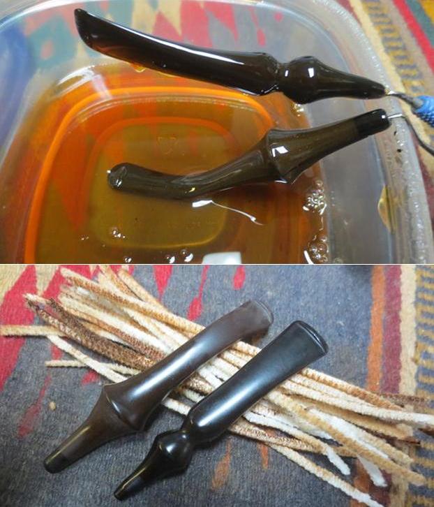 By this time the stems had been soaking since the night before. I took them out of the bath and held them over the container to let the thick solution drip clean of the stems. When the majority had dripped clean I dried them off with a rough cotton cloth the wipe off as much of the oxidation on the rubber as possible in the drying process. I cleaned the airway on both stems with alcohol and pipe cleaners until the deoxidizer and the tars and oils in the stems was removed and they were clean. In retrospect I should have cleaned them before soaking them but hindsight is always better anyway. The stem with the lighter oxidation came out almost perfect. The other one was certainly better than before the soak.