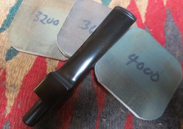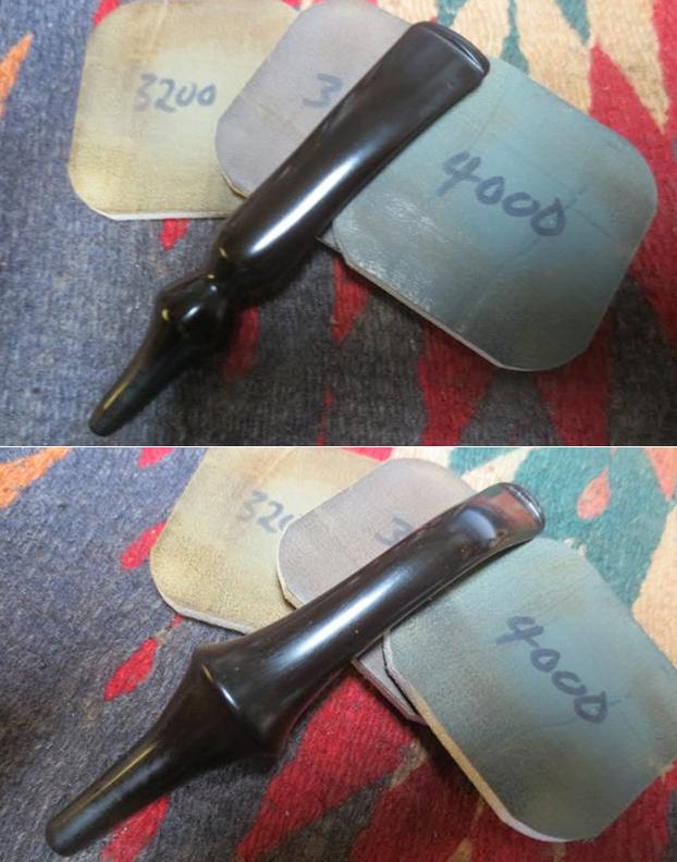 The stems looked good but more work would need to be done before the final black gleam was back. I buffed both stems with red Tripoli to remove the remaining oxidation. I sanded both stems with 220 grit sandpaper to remove the tooth chatter from both sides near the button. I did more work on the stem from the calabash to remove the heavier oxidation of the vulcanite and to reshape the button. Once I was finished with the sanding I buffed both stems again with the red Tripoli. After buffing them I polished them with micromesh sanding pads – wet sanding them with 1500-2400 grit pads and wiping them down after each pad with Obsidian Oil to give the next pad more bite when I sanded. I dry sanded them with 3200-12000 grit pads and again wiped them down with the oil after each pad. After the final pad I wiped them down a final time with the oil and set them aside to dry.