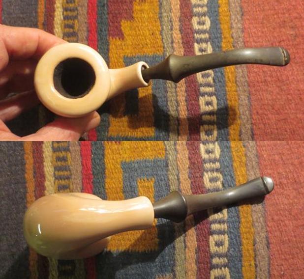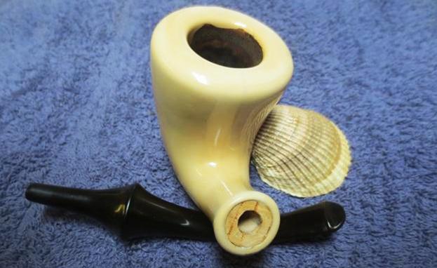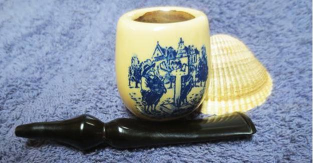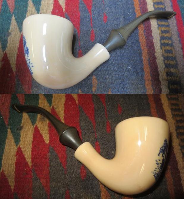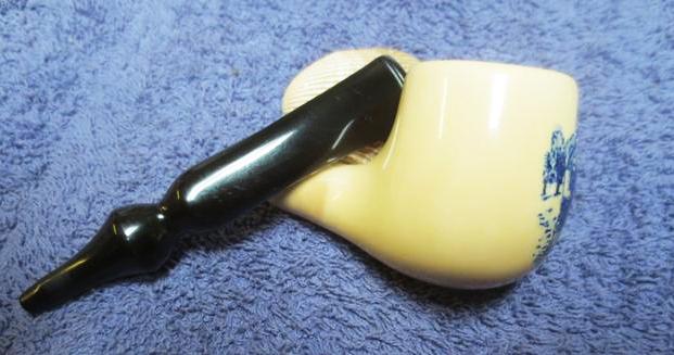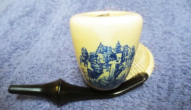 This pair of double walled ceramic pipes was originally white with a blue Delft style scene painted and cured into the ceramic on the front of both bowls. They both have a painting of a scene that is a famous picture from Troost Tobacco where one man is in the stocks and another, rather portly man is helping him smoke a pipe. There is no other stamping on either pipe. Both pipes have begun to develop a nice patina as the bowls darken from smoking them. The stem on the smaller of the two (photos 1-4) was a typical freehand stem like many I have seen and used in the past. The one on the larger calabash (photos 5-8) shaped one is like the stems on WDC Wellington’s – kind of a faux p-lip with the airway coming out the end of the button rather on the top like a Peterson. The smaller pipe had a rubber stopper in the end of the shank to hold the stem in place and the larger one had a crumbling cork stopper. Both pipes were very dirty with cake in the bowls and oxidation on the stem surfaces.