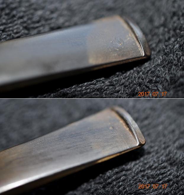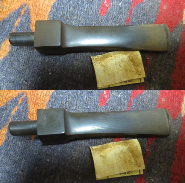 I scraped out the cake in both bowls using the Savinelli Fitsall Pipe Knife. I removed all of the cake and sanded the inside of the bowls with 220 grit sandpaper to remove the remnants. I used a dental pick to clean out the clogged airway at the bottom of each bowl.